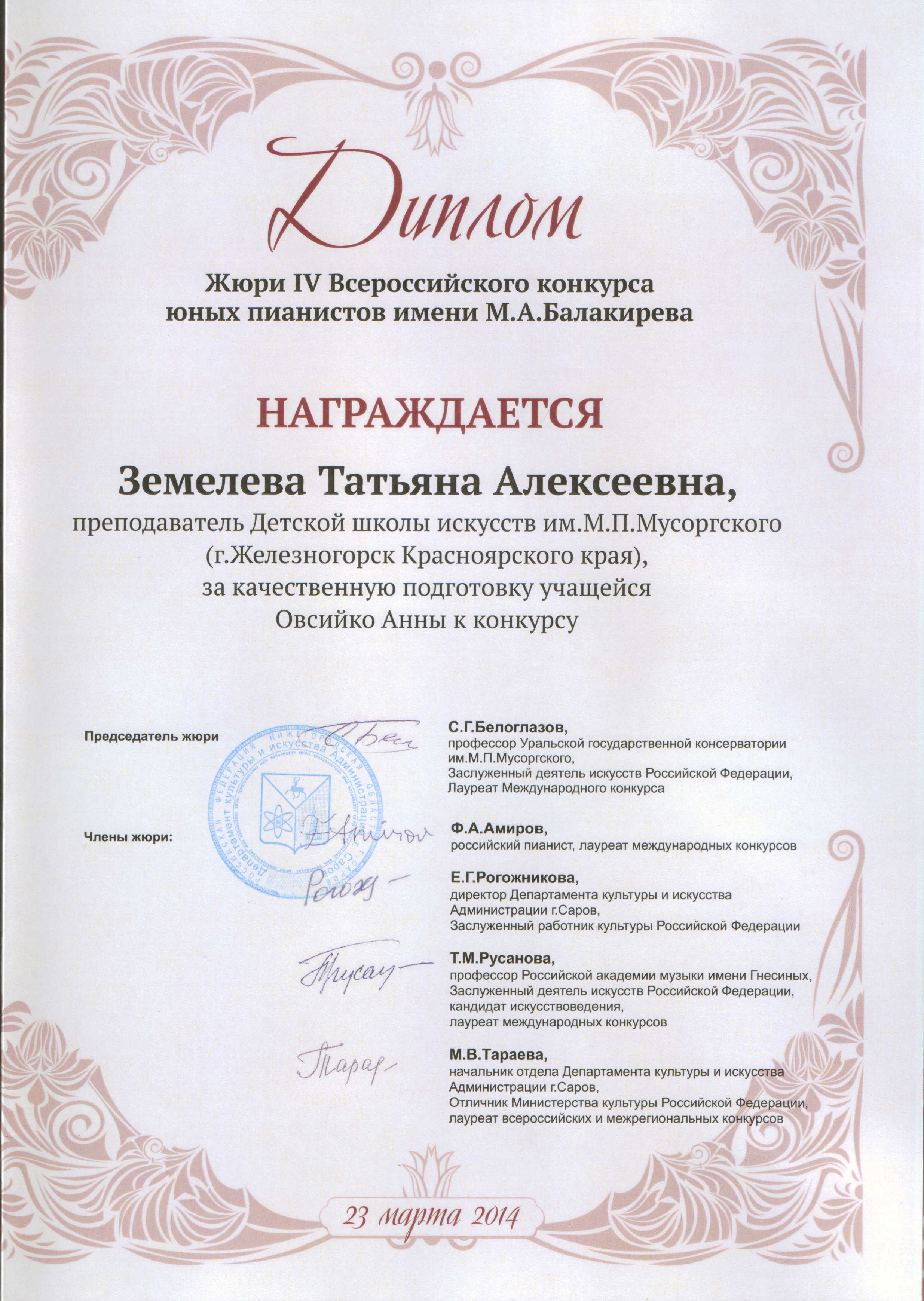 Земелева Татьяна Алексеевна - «За качественную подготовку учащейся Овсийко Анны к конкурсу».