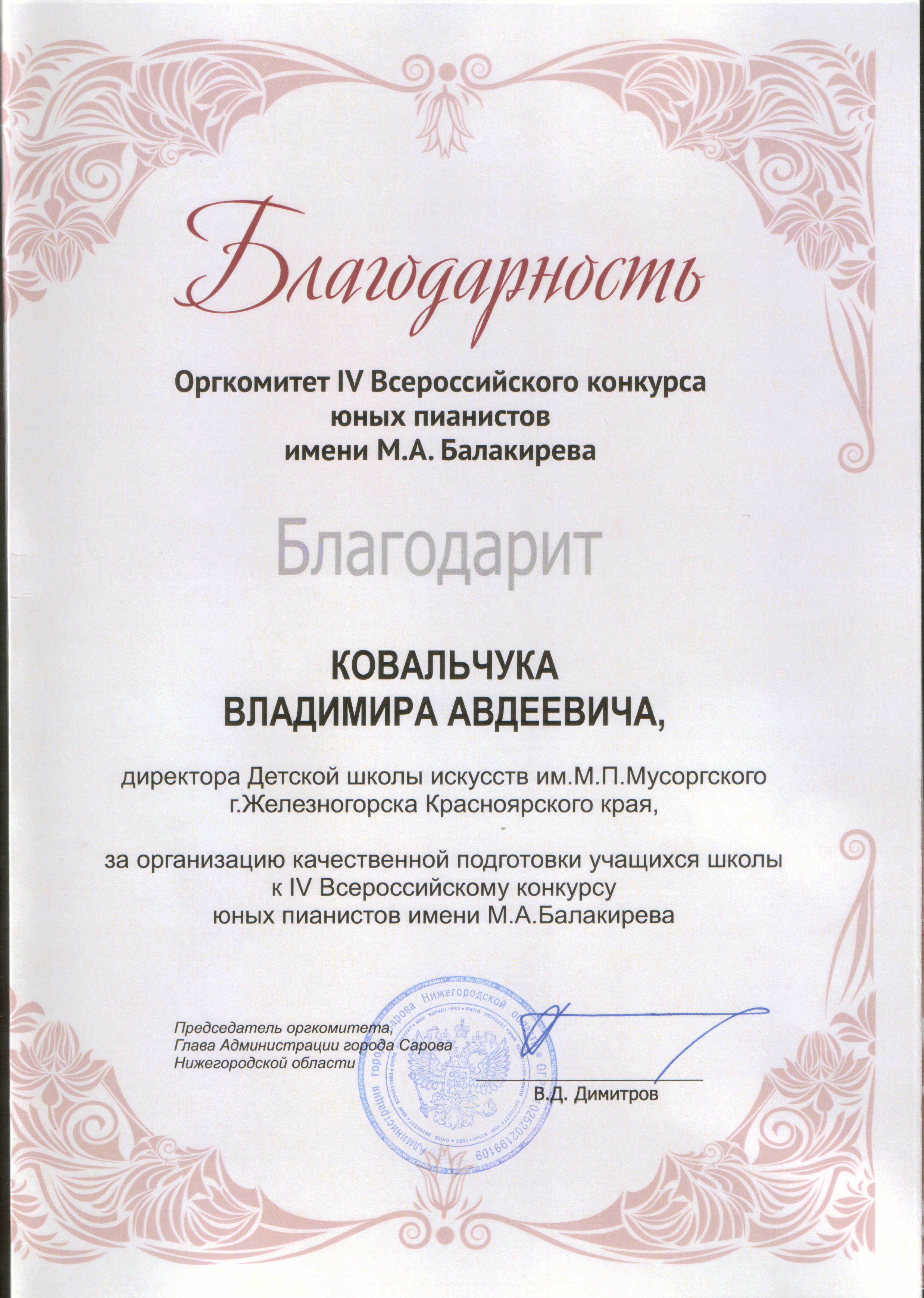 Ковальчук Владимир Авдеевич – «За организацию качественной подготовки учащихся школы к IV Всероссийскому конкурсу юных пианистов имени М.А. Балакирева.